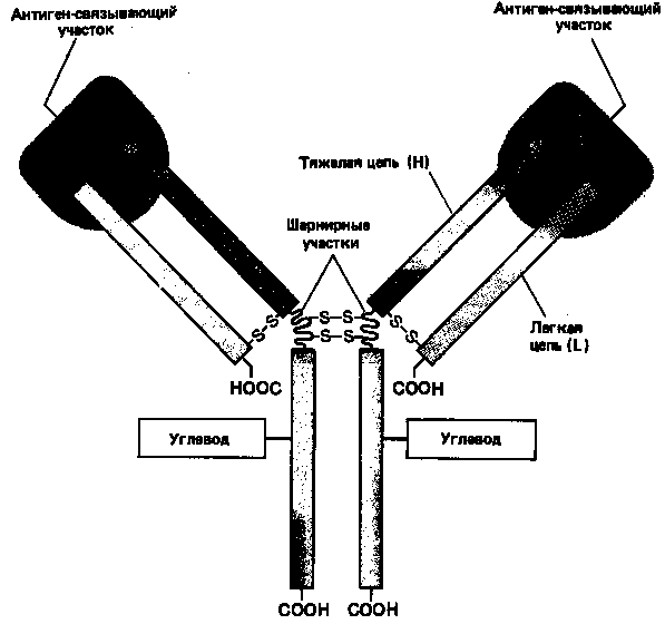 Рисунок 3. Схематическое изображение типичной молекулы антителу состоящей из двух идентичных тяжелых (Н) и двух идентичных лёгких (L) цепей. Антиген-связывающие участки формируются за счет комплекса N-концевых областей L- и Н-цепей, а область «хвоста» образуют только Н-цепи. Каждая цепь содержит одну или несколько олигосахаридных цепочек, функция которых не известна.