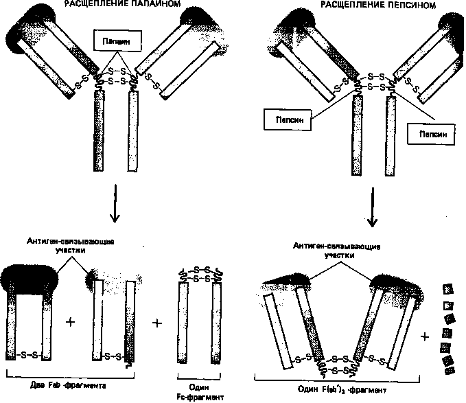 Протеолитические ферменты папаин и пепсин расщепляют молекулы антител на различные характерные фрагменты: папаин дает два отдельных идентичных Fab-фрагмента, каждый из которых обладает одним антиген- связывающим участком, и один Fc-фрагмент (Fab - сокращение слов fragment antigen binding; Fc означает «кристаллизующийся фрагмент» (от crystallizable).; пепсин дает один Р(аb')>2>-фрагмент, состоящий из двух ковалентно связанных Р(аb')-фрагмент (каждый из которых немного больше, чем Fab-фрагмент), и много более лёгких фрагментов (рис. 4). Поскольку Р(аb')>2>-фрагменты бивалентны в отличие от моновалентных Fab-фрагментов сохраняют способность связывать антигены и образовывать преципитаты. Ни один из этих фрагмент обладает другими биологическими свойствами нативных молекул антигенов поскольку они не содержат «хвостовой» (Fc) области, определяющей их свойства.