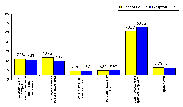 В товарной структуре экспорта товаров в страны дальнего зарубежья в 2007 г. (по данным таможенной статистики) по сравнению с соответствующим кварталом прошлого года сократился удельный вес топливно-энергетических товаров, а также снизилась доля машин, оборудования и транспортных средств.