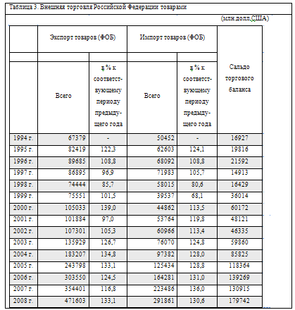 За первые пять лет нового века внешнеторговый оборот, экспорт и импорт России увеличились в фактических ценах в 2,4 раза каждый при сверхвысоких среднегодовых темпах прироста более 19%. Столь стремительному росту внешней торговли способствовали благоприятные условия внутри страны и на внешних рынках. На внутреннем рынке спрос на отечественное сырьё, продукты первого передела и продукцию оборонного комплекса возрастал медленнее, чем возможности её производства, что позволяло наращивать экспортные поставки. Постоянное увеличение совокупного внутреннего спроса – конечного потребления и накопления – стимулировало расширению импорта.