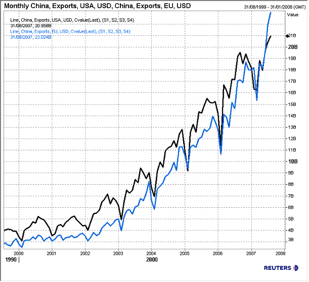 Несколько иначе выглядит ситуация с экспортом. За рассматриваемый период доля экспорта из Китая в азиатские страны сократилась с 60% до 46% (график 3) при том, что аналогичные показателя для остальных основных торговых партнеров не претерпели существенных изменений. При этом к концу 2006 года доля ЕС в качестве экспортного рынка Китая практически сравнялась с долей США: 18,6% и 20,8%, соответственно, а в июле и августе 2007 года абсолютная величина экспорта в ЕС превзошла аналогичный показатель для США (график 4).
