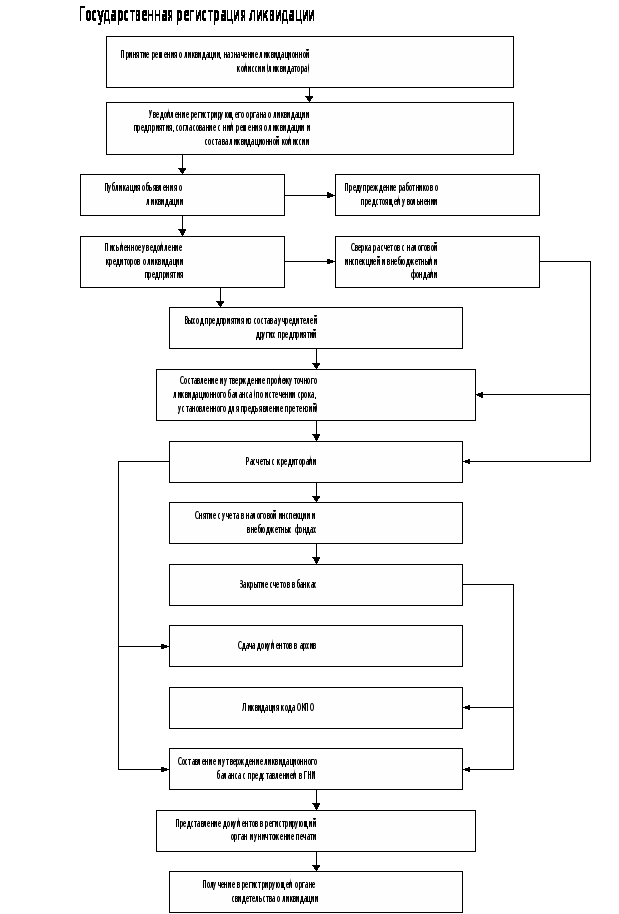 Решение о ликвидации юридического лица должно быть принято уполномоченным на это органом. Участники акционеры юридического лица или органа, принявшего решение о ликвидации, обязаны в письменном виде поставить в известность об этом решении государственный орган, осуществляю-щий государственную регистрацию юридических лиц. С момента назначения ликвидационной комиссии к ней переходит управление делами юридического лица. Ликвидационная комиссия может выступать в суде от имени ликвиди-руемого юридического лица. Ликвидационная комиссия должна сообщить через средства массовой информации о ликвидации юридического лица, порядке и сроках подачи претензий со стороны кредиторов. Срок подачи претензий не может быть менее 2-х месяцев с момента публикации сообщения.