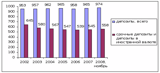Поучительным в этой связи является пример Японии, где наблюдаемое с кризисных явлений 80-х по сегодняшний день бегство от кредита (объем кредитов реальному сектору в период с 2002 по 2008 (ноябрь) годы сократился с 521 до 500 трлн. йен) вызвало проблему нулевых процентных ставок, стагнацию и снижение объема депозитов и паралич банковской системы (таблица 2, диаграммы 2 и 3). В частности, объем депозитов за данный период практически не вырос (с 953 до 974 трлн. йен, то есть на 2%), объем же срочных депозитов и депозитов в валюте снизился с 645 до 558 трлн. иен, то есть более чем на 15%. Это, в свою очередь, ведет к «проеданию» сбережений, то есть направлению их на потребительские цели, и уменьшению инвестиционного потенциала экономики.