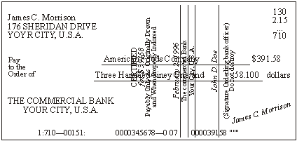 У верхньому правому куті чека зазначається кодовий номер банку, який використовується при сортуванні чеків. У нижньому рядку є цифри, надруковані магнітним чорнилом, що використовуються при комп’ютерній обробці чека: зліва направо — номер чека, кодовий номер банку, номер рахунка клієнта, сума чека.