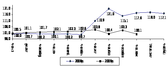 У переробній промисловості за 10 місяців 2009р. індекс виробництва становив 68,8%, що на 2,1 відсоткового пункта перевищує показник січня–вересня 2009р.