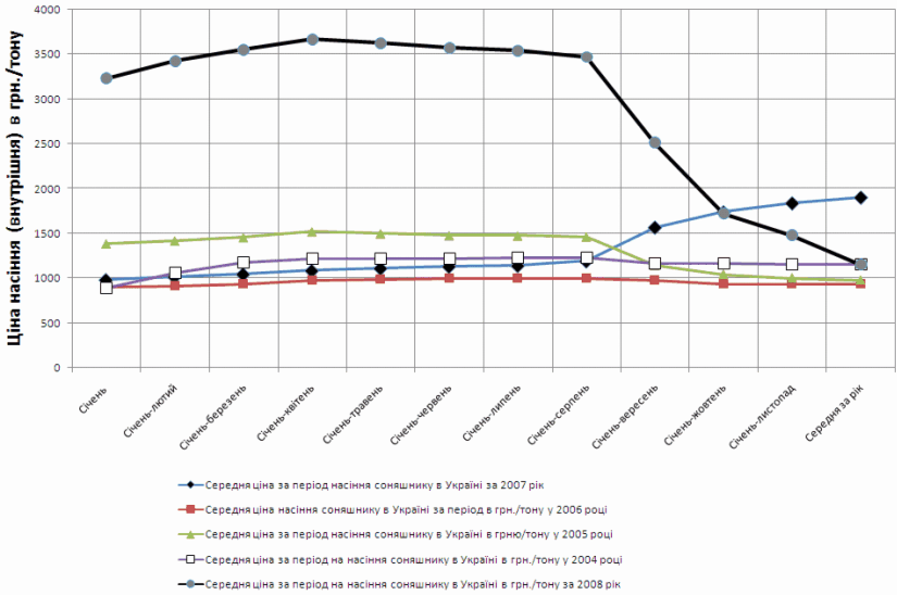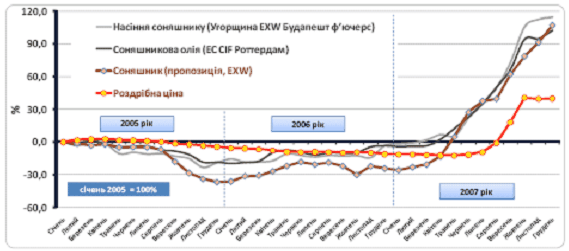 Як показує аналіз результатів розрахунків, у листопаді 2008 року при різькому зниженні світових цін на насіння соняшнику прибутковість ЗЕД операцій по експорту соняшникової олії та їх рентабельність на рівні 23,4% виникає тільки при внутрішній закупівельній ціні не вище 800 1000 грн./тону та курсі долару 8,0 грн./1 долар США з врахуванням експортного відщкодування ПДВ (20% від суми митної вартості товарів при експорті). При підвищенні закупівельної ціни до 1650 грн./тону (внутрішні витрати виробдників України у 2008 році становлять не менше 1600 грн.за 1тону) – ефективність виготовлення олії та її експорту дорівнює нулю.