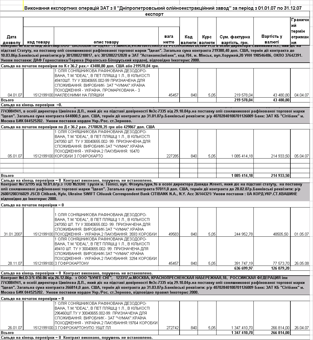 Ціна на ОЛІЮ СОНЯШНИКОВУ РАФІНОВАНУ ДЕЗОДОРОВАНУ, Т.М."IDEAL", В ПЕТ ПЛЯШЦІ 1 Л встановлюється 2,13 долара США за 1 літр на базисі DAF (кордон Україна – Росія). Загальна сума контракта 1 939 343,0 дол. США (один мільйон дев’ятсот тридцять дев’ять тисяч доларів 00 центів), термін дії контракта до 31.12.07р