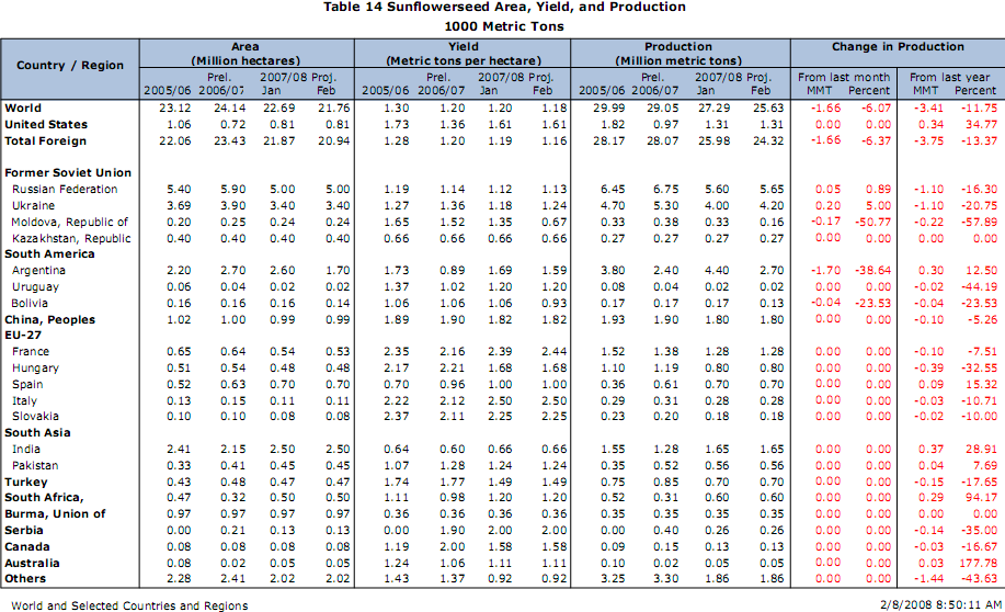 Динаміка світового виробництва соняшника згідно опублікованих даних Департаменту сільського господарства США USDA 8 лютого 2008 року.