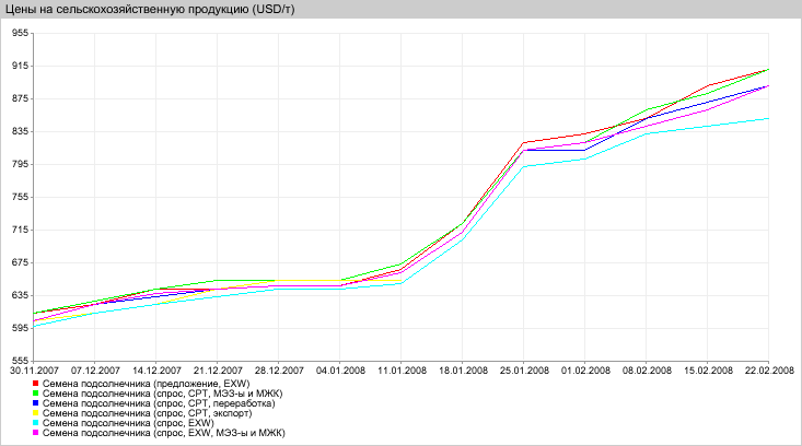 Соняшник - єдина сільськогосподарська культура, що має стійкий попит на світовому агроринку. Тому ціни на нього жорстко прив'язані до долара, і вересневий прорив гривневого коридору 2007 року відразу позначився на ціновій кон'юнктурі. На противагу імпортерам, експортери насіння не лише зберегли свої докризові активи, але й отримали певний зиск, скориставшись зі зростання світових цін на соняшник. З початком маркетингового року експортери перекрили всі рекорди зі швидкості вивезення соняшникового насіння.