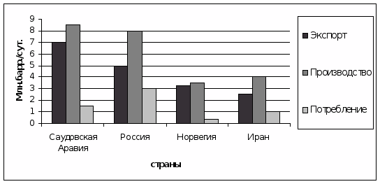 Рисунок 1 – Экспорт, производство и потребление нефти в странах мира в 2003 г.