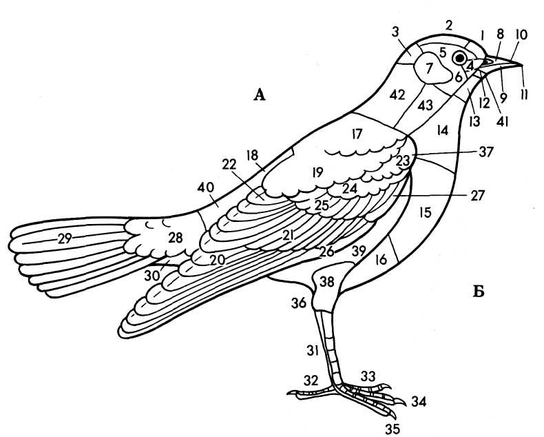 Частини тіла й оперення: 1 — лоб; 2 — тім'я; З — потилиця; 4 — вуздечка; 5 — брова; б — щока; 7 — покривні вуха; 8 — наддзьобок; 9 — піддзьобок; 10 — хребет наддзьобка; 11 — верхівка дзьоба; 12 — кут рота; 13 — горло; 14 — воло (нижня частина шиї); 15 — груди; 16 — черевце; 17 — передня частина спини; 18 — задня частина спини; 19 — плечові пера; 20— махові пера 1-го порядку; 21 — махові пера 2-го порядку; 22 — задні махові пера 2-го і 3-го порядків; 23 — малі покривні пера крила; 24 — середні покривні пера крила; 25 — великі покривні пера передпліччя; 26 — крильце; 27 — покривні пера кисті, або великі верхні покривні пера кисті. Усі нижні покривні пера крила називаються підкриллям; 28 — надхвістя, утворене верхніми покривними перами крила; 29 — стернові пера; 30 — підхвістя, або нижні покривні пера хвоста; 31 — цівка; 32 — задній, або перший, палець; 33 — внутрішній, або другий, палець; 34 — середній, або третій, палець; 35 — зовнішній, або четвертий, палець; 36 — п'ятка; 37 — згин крила; 38—гомілка; 39 — бік; 40 — поперек; 41 — підборіддя; 42 — верхня частина тіла; 43 — шия з боків.