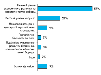 Загалом, стосовно оцінок основних факторів, що гальмують рух України до Європи, позиції українського істеблішменту і населення країни співпадають. В цьому неважко пересвідчитись, співставляючи дані опитувань, наведені на двох діаграмах.