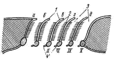 1 — межжаберная перегородка, 2 — жаберные лепестки, 3 — жаберная щель, 4 — жаберные тычинки, I —V —жаберные дуги, а — первая полужабра, б, в, г, д — целые жабры