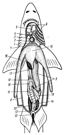 1 — венозный синус, 2 — предсердие, 3 — желудочек, 4 — артериальный конус, 5 — брюшная аорта, 6 — приносящие жаберные артерии, 7 — кювьеров проток, 8 — боковая вена, 9 — желудок, 10 — тонкая кишка, 11 — толстая кишка (просвечивает спиральный клапан), 12 — прямая кишка, 13 — клоака, 14 — ректальная железа, 4 — печень, 5 — желчный пузырь, 11 — желчный проток, 7—поджелудочная железа, 19 — селезенка, 20 — правая почка (левая не изображена)