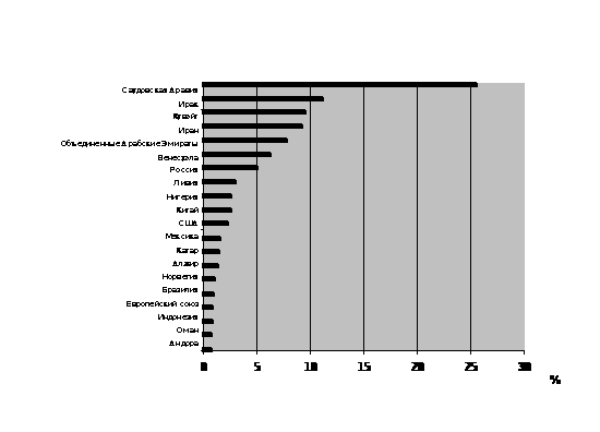 На начало XXI века нефть остается важнейшим мировым энергетическим ресурсом и крупнейшим объектом международной торговли. Вместе с тем нефть является исчерпаемым ресурсом и по имеющимся относительно новым прогнозам при текущем уровне добычи мировая обеспеченность нефтью составляет по крайней мере порядка 40—50 лет. Самые большие запасы нефти – около 25% всех мировых запасов – находятся на территории Саудовской Аравии. Доказанные запасы нефти в России составляют примерно 5,5% мирового – около 8 млрд. тонн, в США – около 4 млрд. тонн (2,2% общемировых), (рис. 1).