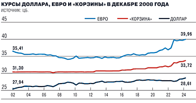 Рис. 1 – Курсы доллара, евро и «корзины» в декабре 2008г (источник: ЦБ РФ).