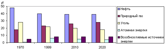 Как видно из рисунка 1, доля нефти в мировом энергобалансе снизилась с 48% в 1970 г. до 40% в 2008 г., при этом наблюдается неуклонный рост доли природного газа, атомной энергии и энергии из возобновляемых источников.