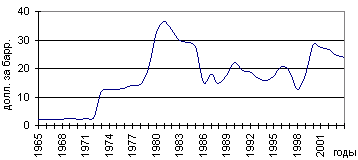 Вместе с тем развивающиеся страны — крупнейшие экспортеры нефти, обеспечивая почти три четверти добычи нефти в мире, были крайне недовольны сложившимся мировым порядком распределения доходов от реализации этой нефти и считали его исключительно несправедливым. В итоге 13 развивающихся стран — основных экспортеров нефти с целью отстаивания своих интересов на мировом рынке нефти организовали ОПЕК и чуть позднее национализировали добычу на своей территории. Эти события привели к так называемому «нефтяному кризису», в итоге чего цены на нефть «взлетели» за 2 последующих года более чем в 5 раз, что совпало с общим сырьевым и валютно-финансовым кризисами, охватившими в этот период всю мировую экономику (см. рис.).