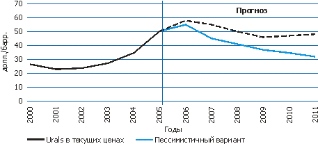 Прогноз 2006 года предполагал, что пик цен 2008 г. будет не самым мощным и после некоторого снижения (до 100 долл./барр.) цены в соответствии с волновой динамикой вновь поднимутся в 2010-2011 гг. до уровня 150 долл. за баррель. Только после этого ожидается снижение до 50 долл. за баррель и затем на достаточно длительное время стабилизация в коридоре 60-80 долл. за баррель.
