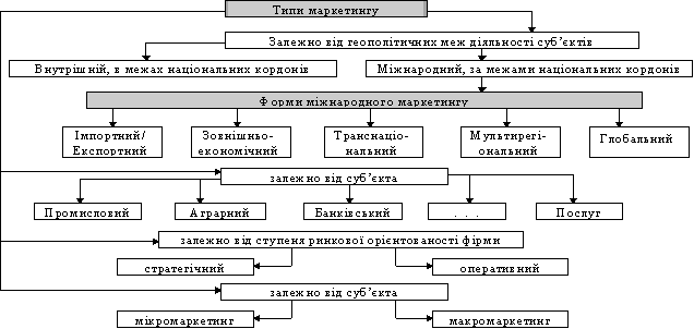 За майже сторічну історію розвитку концепція маркетингу еволюціонувала від переважно внутрішнього, оперативного та промислового до міжнародного, стратегічного та розгалуженого за об’єктами маркетингу (промисловість, банківська сфера, послуги, інвестиції тощо). Можна виділити чотири критерії типізації маркетингу та шість форм міжнародного маркетингу (рис. 2).