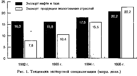 Для современной международной специализации России помимо нефти и газа становится характерной и продукция некоторых других отраслей промышленности, отличающихся, как правило, низкой технологичностью и экологичностью. В их числе - черная и цветная металлургия, базовая химия, целлюлозно-бумажная промышленность. Совокупная доля этих отраслей в российском экспорте за 1992-1996 гг. выросла в 2 раза. При этом стоимость экспорта неэкологичных отраслей промышленности выше, чем совокупная стоимость вывоза нефти и газа (рис. 1).