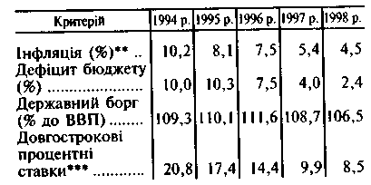 У таблиці наведено динаміку основних макроекономічних показників Греції протягом другої половини 90-х років (за даними Євростату), за якими визначають рівень економічної конвергенції в ЄС, необхідний для вступу до валютного союзу. Як бачимо, протягом 1994–1998 pp. Греції вдалося скоротити інфляцію більш як удвічі – з 10,2 до 4,5%. Нагадаємо, що в 1990–1991 pp. інфляція в Греції становила 18–20%. Отже, з того часу досягнуто значного прогресу. При утворенні валютного союзу верхньою межею інфляції для країн-членів було визначено 2,7%. На сучасному етапі розвитку валютної інтеграції в Європі країна – претендент на членство у валютному союзі змушена буде орієнтуватися на 2% інфляції за рік. По-перше, у 1998 р. інфляція в таких країнах, як Франція, ФРН, Австрія, становила лише 0,5–0,6%, додамо ще 1,5 процентного пункту для визначення верхньої межі, згідно з маастрихтським критерієм, і отримаємо 2,0–2,1%. По-друге, відповідно до формулювання Ради керуючих Європейського центрального банку (ЄЦБ), під стабільністю цін розуміється така їхня динаміка, за якої гармонізований індекс споживчих цін по всій «зоні євро» збільшується по відношенню до попереднього року не більш як на 2%.