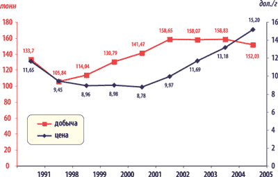 Особенностями рынка золота является то, что, во-первых, золото используется фактически всеми государствами в качестве страхового и резервного фонда. Учтенные государственные запасы золота, сосредоточенные в Центральных банках и резервах МВФ, составляет сегодня более 31000 т. значительная часть этих запасов может быть выставлена на продажу. Во-вторых, еще большие объемы золота имеются у населения (ювелирные украшения, монеты и др.). Часть этого золота – по крайней мере, в виде лома – также поступает на рынок. В результате вырисовывается следующая картина. Основная доля в предложении золота приходится на его добычу. Но объемы добычи обладают значительной инерционностью, соответственно предложение добытого золота из года в год имеет относительно небольшую вариацию – значительно меньшую, чем предложение золотого лома, продажа золота банками и инвесторами.