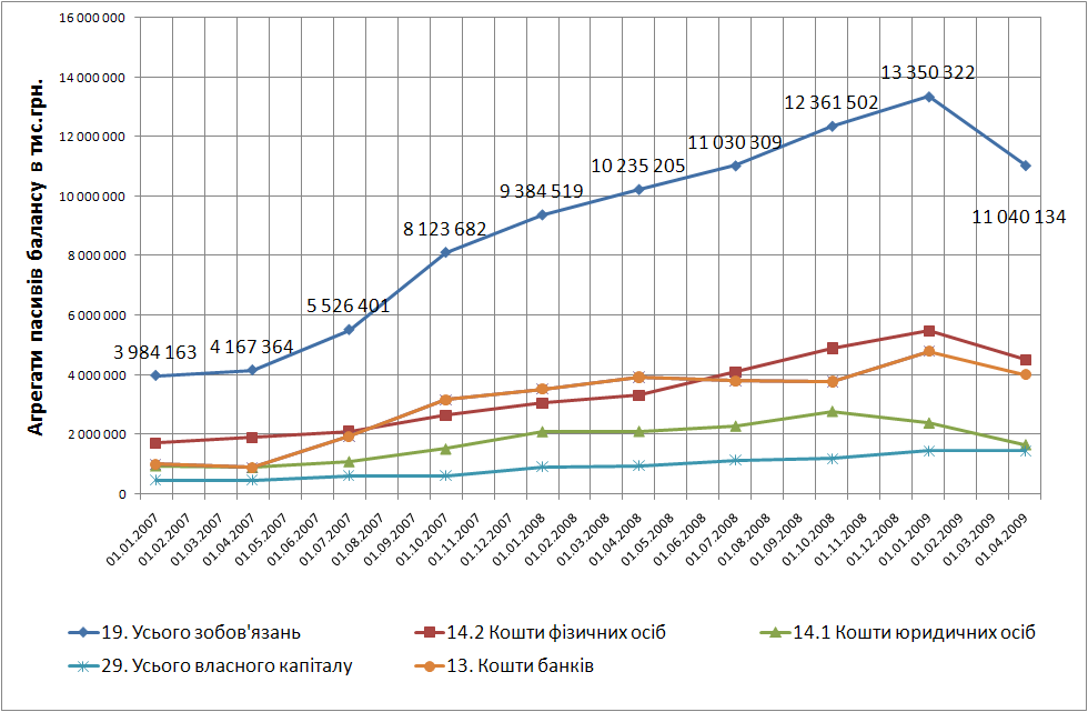 Рис.В.1. Динаміка рівнів основних агрегатів джерел ресурсів в пасивах балансу ВАТ АБ «Укргазбанк» у 2007 2009 роках [61]