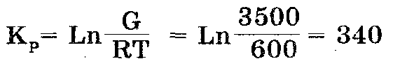 Между тем константа равновесия К>р> связана со свободной энергией реакции отношением в виде G = RTInК>р>, где R есть около 2 кал/моль, а Т есть 25°С (температура, при которой протекают многие биологические реакции). Допуская, что совместная энергия гидролиза АТФ к АДФ обеспечивает эту реакцию с 50-процентной эффективностью, можно далее допустить, что транспортная система будет располагать примерно 3500 калориями (из общего количества энергии в 7000 калорий) на 1 моль АТФ, гидролизуемого при определенных физиологических условиях. Следовательно, константа равновесия будет равна: