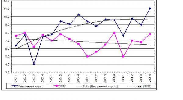Рис. 2. Тем прироста внутреннего спроса и ВВП, %