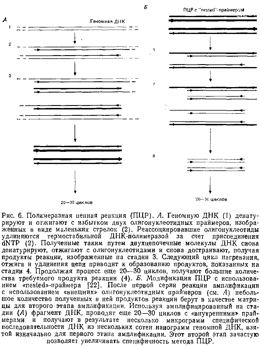 Если при амплификации геномной ДНК позвоночных в качестве праймеров для ПЦР используют олигонуклеотиды длиной 20 нуклеотидов и более, то процесс этот довольно специфичен и амплифицируется только один фрагмент ДНК – Однако иногда среди продуктов реакции наблюдается накопление фрагментов, происхождение которых трудно объяснить. А поскольку эти фрагменты могут мешать последующему анализу, то рекомендуется провести еще одну серию амплификации, с использованием другого набора олигонуклеотидных праймеров. Этот метод, именуемый «nested oligo», состоит в следующем: продукт первичной полимеразной цепной реакции используется в качестве матрицы в последующих раундах ПЦР, но уже с двумя другими олигонуклеотидами, имеющими гомологии с участками ДНК внутри первичного амплифицированного фрагмента. Такая процедура позволяет получить большое количество индивидуальной последовательности ДНК, несколько более короткой, чем исходный фрагмент, и использовать ее для последующего анализа.