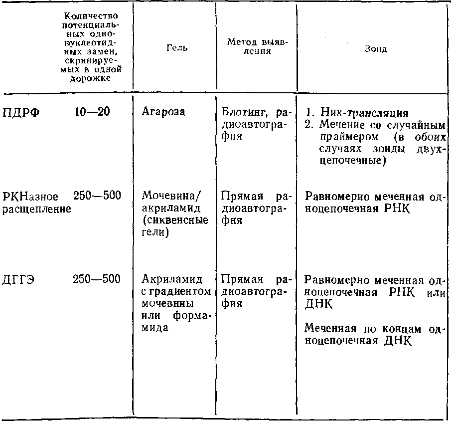 РНКазное расщепление и ДГГЭ можно использовать для непосредственного исследования фрагментов геномной ДНК, минуя стадию клонирования. Работая с равномерно меченными зондами, обладающими высокой удельной активностью, можно любым из этих методов получить желаемый результат, имея изначально 5–10 мкг геномной ДНК человека и проводя радиоавтографию 24 ч. Чем проще организм, тем выше чувствительность методов. Хотя получаемые результаты в большинстве своем можно оценить высоко, непосредственное использование суммарной геномной ДНК ставит перед исследователем ряд проблем. Это, во-первых, нередко низкое отношение сигнала к фону, особенно при РНКазном расщеплении. Во-вторых, активность равномерно меченных фосфором зондов должна быть настолько высокой, чтобы использовать их в течение дня или двух. В-третьих, при проведении некоторых анализов, особенно в случае множественных тестов, лимитирующим фактором может стать количество геномной ДНК. Любой тест тем предпочтительнее, чем меньшее количество ДНК требует.