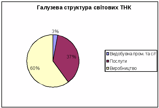 Більшість ТНК (майже 60%) зайняті в сфері виробництва, 37% - в сфері послуг і тільки 3% в сфері видобувної промисловості та сільського господарства.