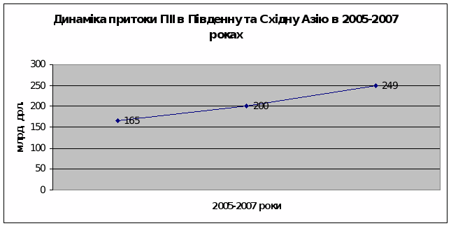 Притока ПІІ до Південної, Східної і Південно-східної Азії досягла в 2005 році 165 млрд. дол., що відповідає 18% від загальносвітової притоки ПІІ. Майже половина притоки ПІІ в регіон поступало з країн базування, що розвиваються, в основному з того ж регіону. ПІІ в підприємствах оброблювальної промисловості все ширше притягувалися в країни Південної, Східної і Південно-східної Азії, хоча конкретні точки додатку інвестицій змінюються через просування цих країн вгору по ланцюжку створення вартості. Даний сектор як і раніше привертає крупні об'єми інвестицій, особливо в автомобільну, електронну, сталеву і нафтохімічну галузі промисловості. Країни Південної, Східної і Південно-східної Азії продовжують процес розширення доступу в їх економіку для ввезення ПІІ. Значні кроки в цьому напрямку були зроблені в 2005 році, зокрема в секторі послуг. Крім того, країни Південної, Східної і Південно-східної Азії перетворюються на джерело ПІІ (до країн, що розвиваються), при цьому відток ПІІ склав в 2005 році 68 млрд. дол. Це, правда, означає зниження на 11% в порівнянні з 2004 роком. Багато країн регіону акумулювали крупні іноземні резерви, що, можливо, послужить поштовхом до розширення вивозу ПІІ. Китай і Індія енергійно набувають нафтових активів і навіть співробітничають по деяких заявках. На рис. 2.7. показано динаміку притоки ПІІ в країни Південної та Східної Азії.