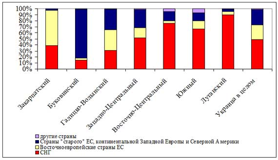 1. Закарпатский. Этот район охватывает одноименную область, которая характеризуется наивысшим среди всех регионов Украины уровнем участия населения в трудовых миграциях. Основным направлением трудовых поездок являются соседние страны ЕС - Чехия, Венгрия и Словакия. Это обусловлено, во-первых, географической близостью, во-вторых, этническими особенностями региона (здесь живет основная часть украинских венгров и словаков), в-третьих, историческими связями (Закарпатье в разные времена входило в состав Венгрии и Чехословакии). Уровень ориентации на страны СНГ (в первую очередь Россию) заметно меньше, чем в восточных и южных регионах, но выше, чем в двух других районах, полностью расположенных в пределах Западной Украины.