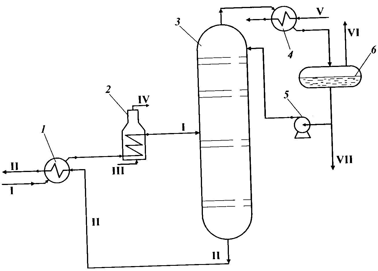 Нестабильная (сырая) нефть I подогревается вначале в теплообменнике 1 потоком уходящей с установки стабильной нефти II, затем в печи 2 и поступает в ректификационную колонну 3 (стабилизатор). Легкие углеводороды, выходящие с верха колонны, конденсируются в холодильнике 4 и собираются в емкости 6, откуда они передаются-потребителям как ШФЛУ (VII). Часть ШФЛУ поступает в верхнюю часть колонны как орошение для снижения потерь легких углеводородов. Стабильная нефть П из куба колонны 3 проходит теплообменник 1, где отдает тепло поступающей на установку сырой нефти I, и направляется потребителям.