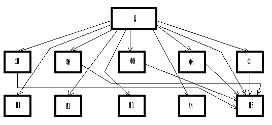 На рис. 1 административные связи функциональных начальников с исполнителями (И1 - И4) такие же, как и для исполнителя И5 (они не показаны в целях обеспечения ясности рисунка). В этой структуре нарушен принцип единоначалия и затруднена кооперация. Практически она не используется.