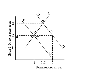 Напротив, для Англии указанное изменение валютного курса ведет к падению доллара в фунтах стерлингов (с 1/2 ф. ст. до 1/3 ф. ст. за 1 долл.). Американские товары в Англии становятся дешевле, что приведет к росту американского экспорта в Англию (на рис. 2 это изображено сдвигом от точки «a» к точке «c», т. е. увеличение предложения фунтов стерлингов).