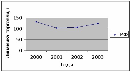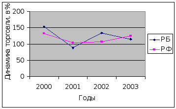 Как видно из приведенного ниже рисунка 2.4 динамика внешней торговли РБ в 2003 году сильно упала, относительно предыдущего года, в последующие же годы она испытывала небольшие подъемы, которые не смогли компенсировать потери 2003 года. Динамика же внешней торговли РФ планомерно с 2001 года увеличивается, и в скором времени достигнет уровня 2000 года.