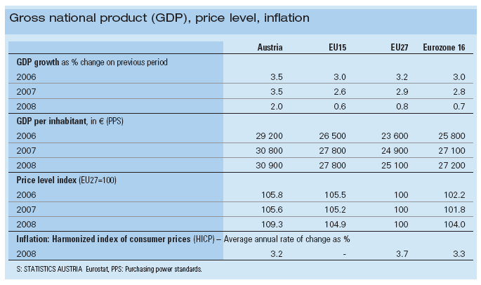 Согласно предварительным вычислениям, в 2008 австрийская экономика выросла на 2.0 %. Несмотря на уменьшение по сравнению с уровнем в 2007 (3.5 %), это развитие существенно превышает средний рост 27 государств ЕС (0.8 %) и других 16 европейских государств (0.7 %). Валовой внутренний продукт в текущих ценах рос на €11,1 миллиардов, или приблизительно на 4.1 %, и составил €281,9 миллиарда. Это составляет 33 800€ (+3.6 %) ВВП на душу населения.