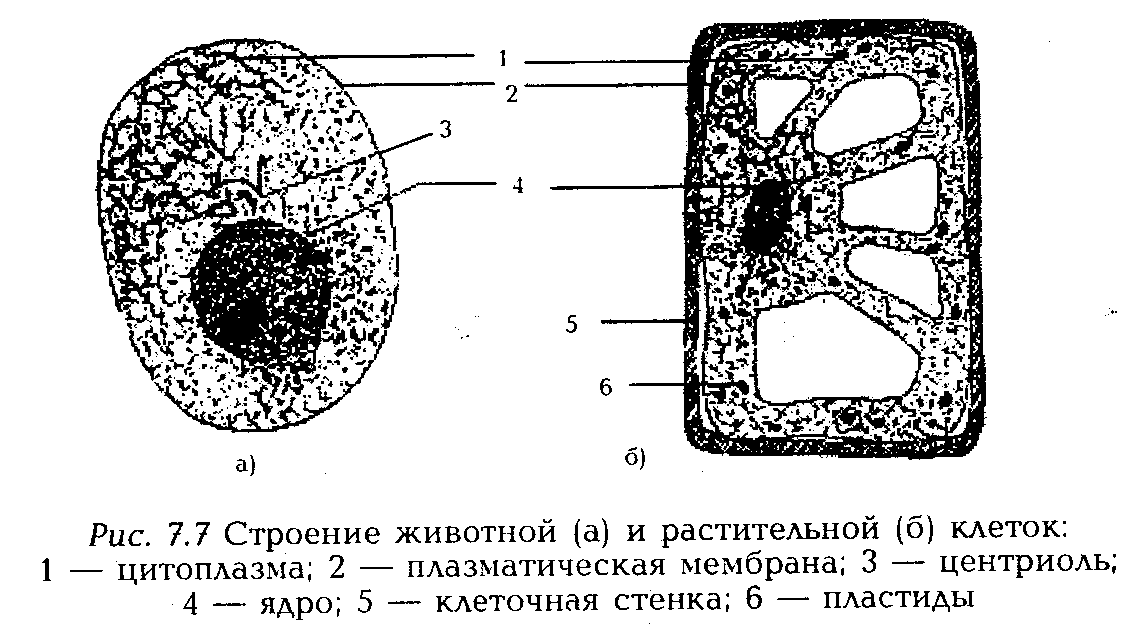 Несмотря на большое разнообразие и существенные различия во внешнем виде и функциях, все клетки состоят из трех основных частей – плазматической мембраны, контролирующей переход вещества из окружающей среды в клетку и обратно, цитоплазмы с разнообразной структурой и клеточного ядра, содержащего носитель генетической информации – ДНК (см. рис. 7.7). Все животные и некоторые растительные клетки содержат центриоли – цилиндрические структуры диаметром около 0,15 мкм, образующие клеточные центры. Обычно растительные клетки окружены оболочкой – клеточной стенкой. Кроме того, они содержат пластиды – цитоплазматические органоиды (специализированные структуры клеток), нередко содержащие пигменты, обусловливающие их окраску.