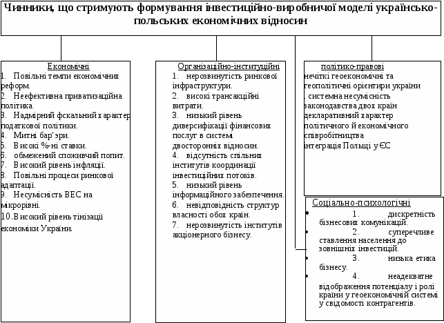 по-перше, несумісність економік країн-партнерів і, зокрема, домінування в Україні в останні роки детенсивного типу відтворення з властивими йому рисами руйнації виробничого потенціалу, низької ефективності його використання, повзучого спаду виробництва, а в Польщі – інтенсивного типу ВЕС з наростаючими темпами виробництва, появою полюсів росту, інтенсивним розвитком підприємництва; переважання в економіці України великих підприємств, які характеризуються низькою мобільністю, непристосованістю до ринкових умов, і, відповідно, – високого ступеня монополізації та концентрації виробництва, недостатнього рівня конкуренції, а в Польщі –підприємств малого і середнього бізнесу, високої конкуренції та, відповідно, формування підприємницької здатності працювати в умовах конкурентного ринку; певна інституціональна несумісність економік, яка полягає у домінуванні в Україні підприємств державної та колективної власності при незначній частці приватної, а в Польщі – приватної, що створює певні бар’єри налагодження партнерських стосунків, як у торгівлі, так і в спільній організації виробництва, а також у нижчому рівні розвитку в Україні порівняно з Польщею інститутів ринкової інфраструктури;