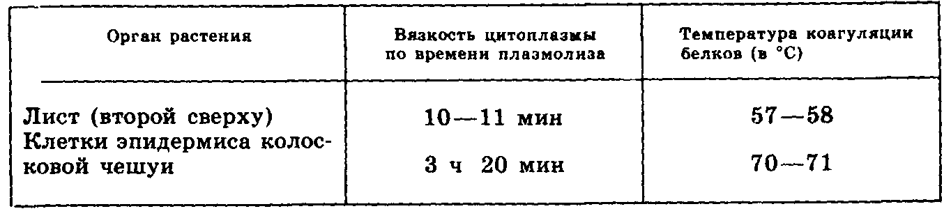 Насколько тесно связана вязкость цитоплазмы с температурой коагуляции белков, видно на примере озимой ржи. Вязкость цитоплазмы в различных органах ржи неодинакова. В тех органах, где она выше, белки цитоплазмы свертываются при более высокой температуре.