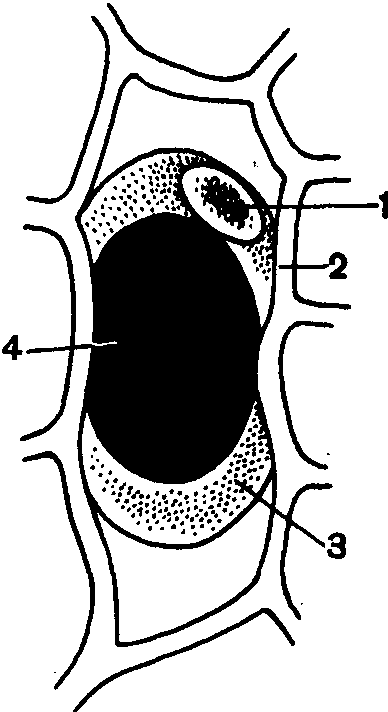 Лейкопласты в эпидермисе листьев традесканции: 1— лейкопласты; 2—ядро; 3— оболочка