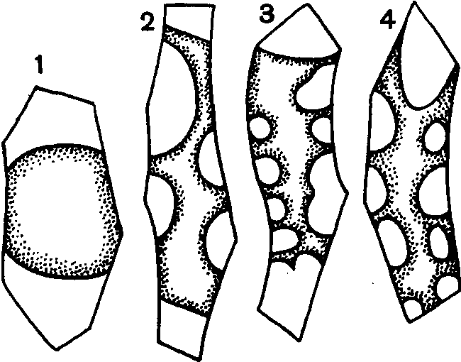 Схематическое изображение различных форм плазмолиза: 1 — выпуклая; 2 — вогнутая; 3, 4 — судорож