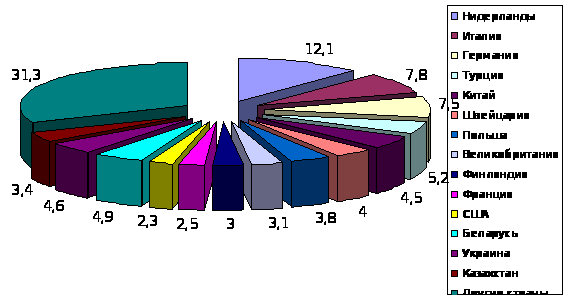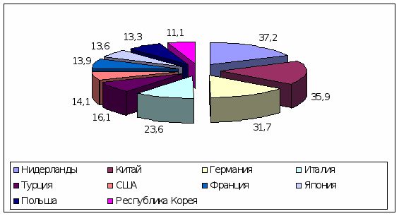 Основными торговыми партнерами России в январе-августе 2010 года среди стран дальнего зарубежья были: Нидерланды, товарооборот с которыми составил 37,2 млрд.долларов США (155,1% к январю-августу 2009 года), Китай – 35,9 млрд.долл.США (157,1%), Германия – 31,7 млрд.долл.США (134,7%), Италия – 23,6 млрд.долл.США (120,7%), Турция – 16,1 млрд.долл.США (134,5%), США – 14,1 млрд.долл.США (133,4%), Франция – 13,9 млрд.долл.США (140,6%), Япония – 13,6 млрд.долл.США (153,4%), Польша – 13,3 млрд.долл.США (138,4%), Республика Корея – 11,1 млрд.долл.США (182,2%).