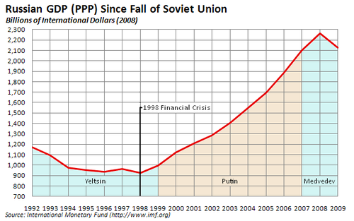 По итогам первого квартала 2010 года, по темпам роста ВВП (2,9 %) и роста промышленного производства (5,8 %) Россия вышла на 2-е место среди стран «Большой восьмёрки», уступив только Японии.