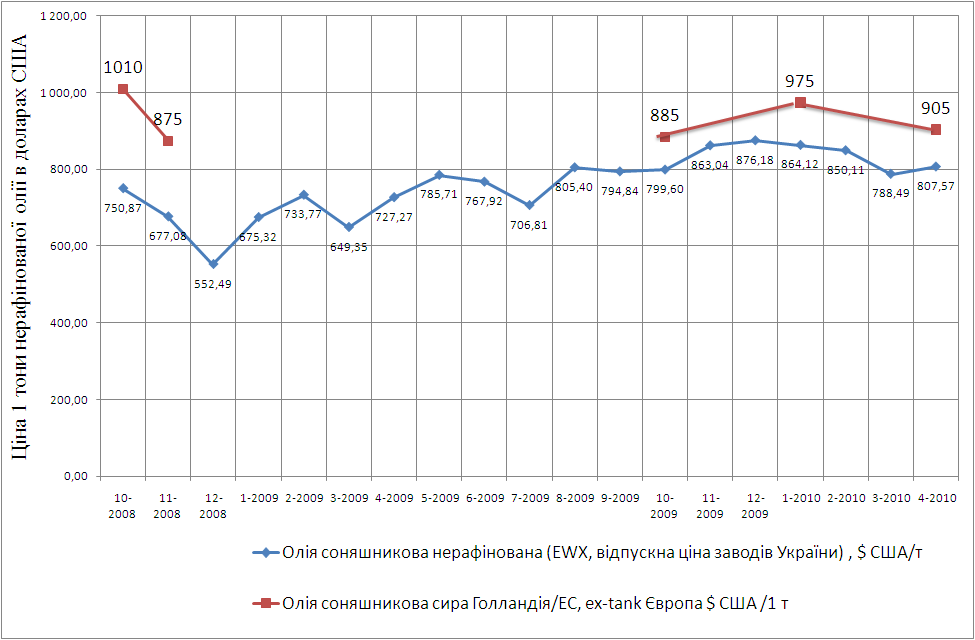 В табл.1.1 наведений баланс попиту і пропозиції олії соняшникової в Україні у 2009/2010 МР (тис. тон) [47]. У 2009/2010 МР виробництво насіння соняшнику склало 6,4 млн. тон, що дасть змогу повною мірою задовольнити потреби внутрішнього ринку та виробити близько 2,4-2,5 млн. тон олії. Внутрішнє споживання олій рослинних у перерахунку на рік оцінюється 14,2 кг на особу (раціональна норма 13 кг на особу на рік). Експортні можливості у поточному маркетинговому періоді оцінюються у межах 2,0-2,1 млн. тон. Питома вага України у світовому виробництві соняшнику та олії, виробленої з нього, складає близько 15%. За попередніми даними у 2008/09 маркетинговому році виробництво олії соняшникової склало 2498 тис. тон. За вересень-листопад 2009/2010 МР –964,5 тис. тон (табл.1.2) [46].