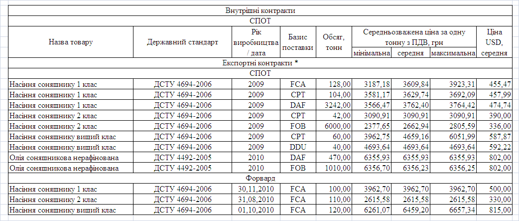 Товар - Насіння соняшника у лушпині неподрібнене, каліброване, чорне,українського походження,насипом (Врожай-2009р. Вологість-7,0%. Смітна домішка-3,0%. Вміст олії-44,0%) на умовах ФОБ порти Азовського або Чорного морів України з поставкою протягом 1 місяця з дня підписання договору приблизно рівними місячними партіями, якщо не буде іншої домовленості.