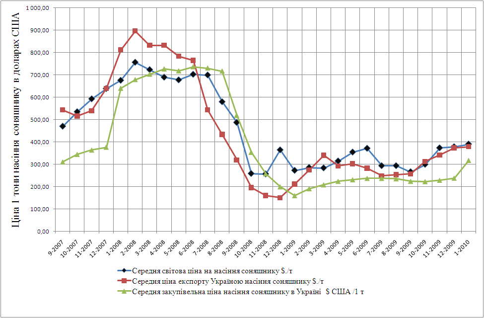 На сьогодні Україна є одним з основних світових виробників насіння соняшнику. Виробництво соняшнику у 2008/2009 МР в усіх категоріях господарств становило 6,5 млн. тонн у вазі після доробки, у 2009/2010 за попередніми даними зібрано 6,4 млн тонн., що становить 97,5% до попереднього МР (табл.1.3).
